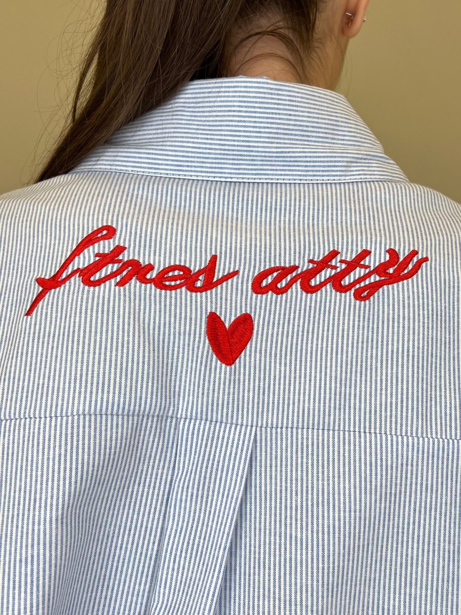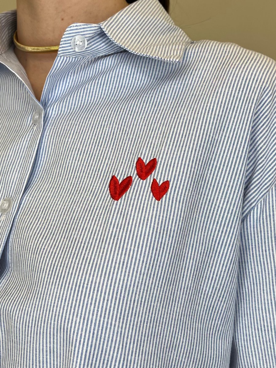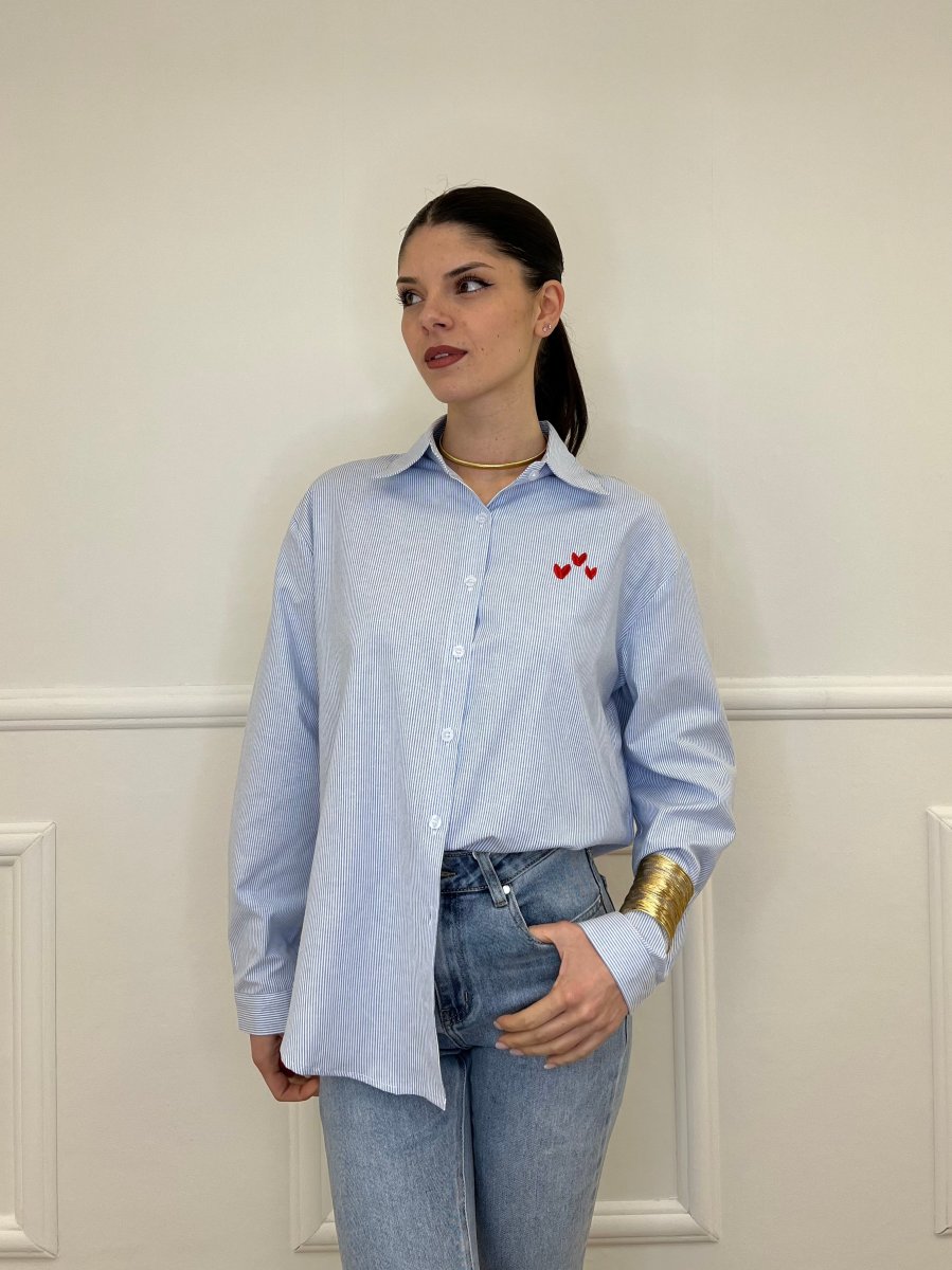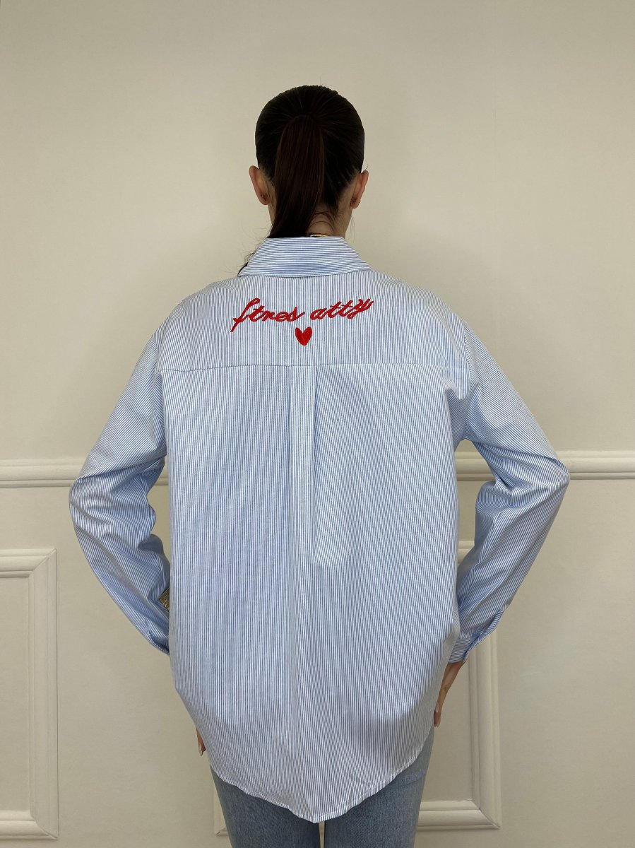 Camicia oversize in misto cotone in fantasia bastoncino con ricamo frontale lato cuore, fondo tondato e ricamo posteriore.