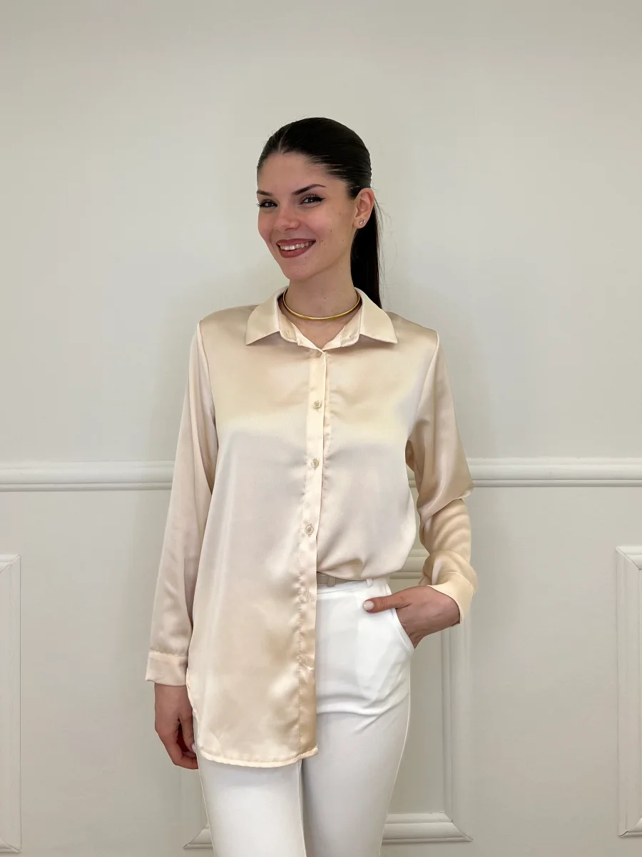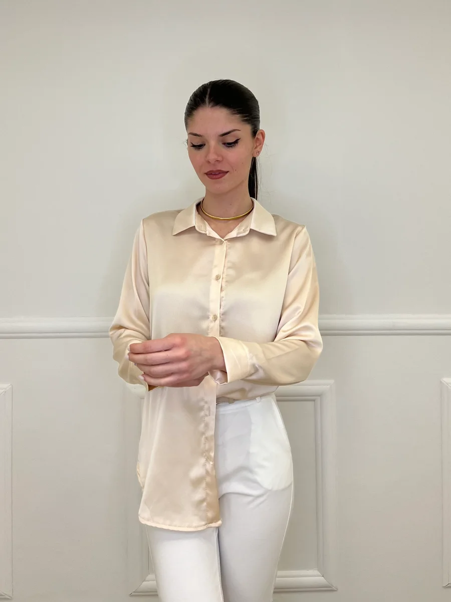 Camicia basic in satin in tinta unita con bottoni in madreperla e sfondo piega posteriore.