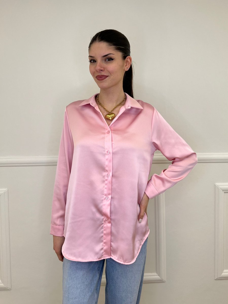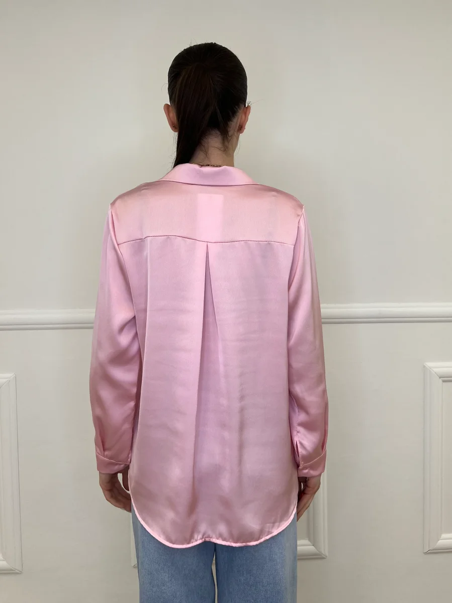 Camicia basic in satin in tinta unita con bottoni in madreperla e sfondo piega posteriore.