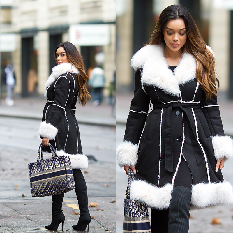 Elegante cappottino invernale molto caldo e confortevole, ma nello stesso tempo femminile e raffinato. Con inserti in pelliccia sintetica. Completo di cintura in tessuto coordinato.