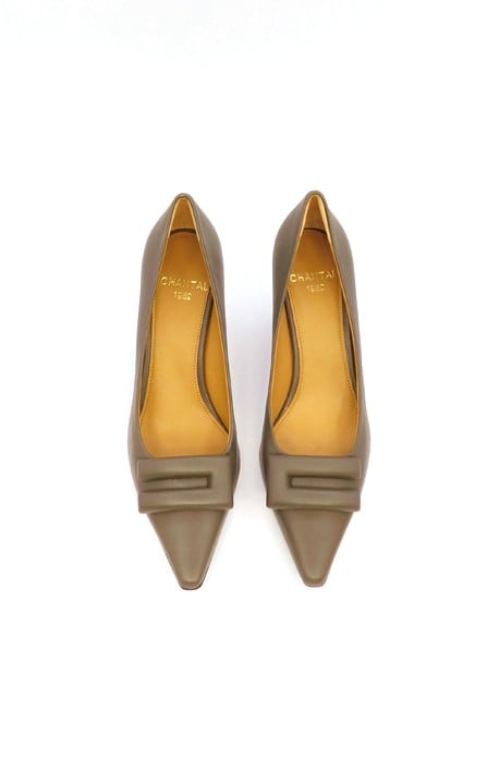 Décolleté in vitello con accessorio tono su tono. Interno in pelle. Tacco a rocchetto 6 cm. Fondo in cuoio e gomma.