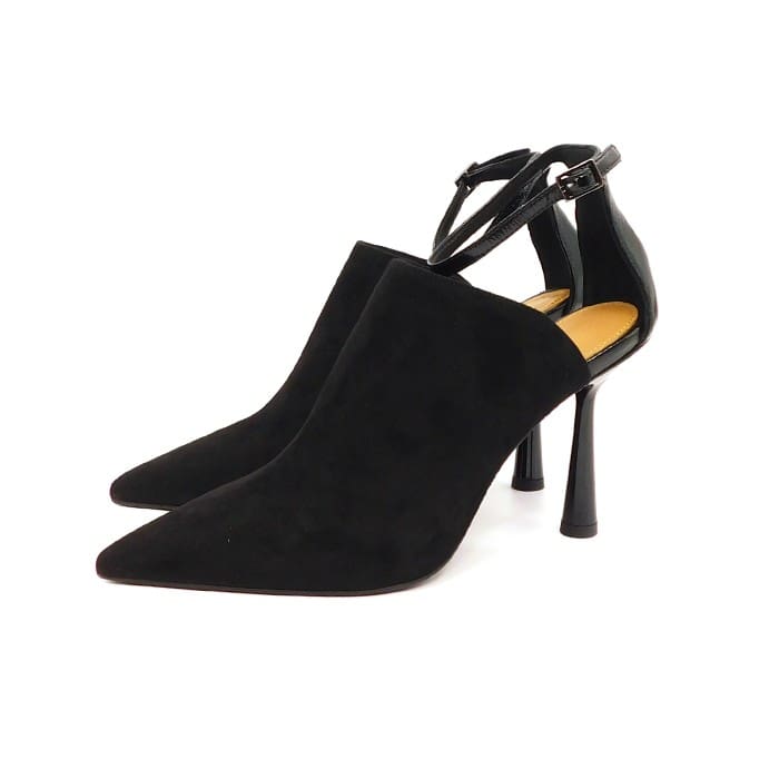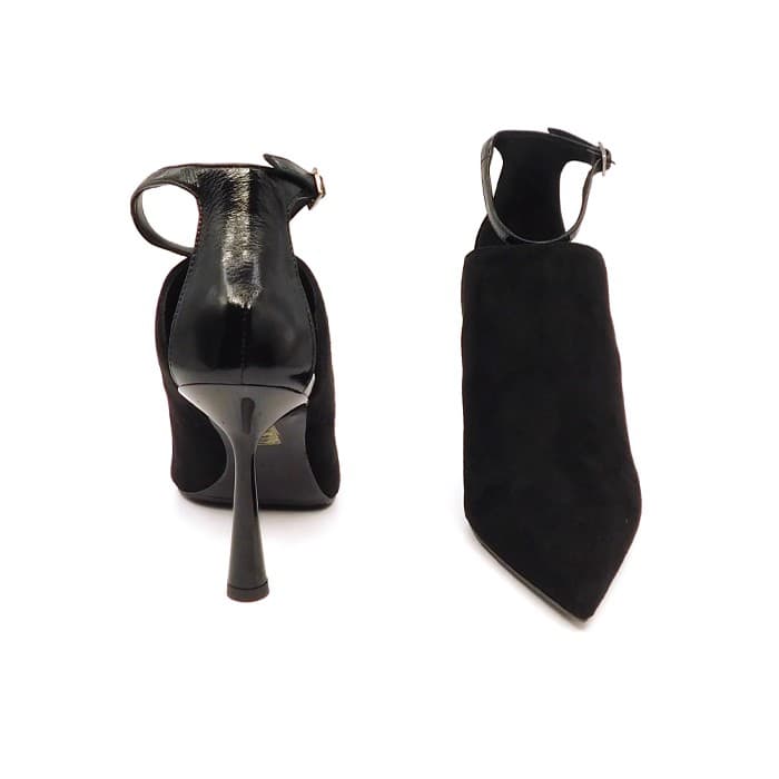 Décolleté accollato in camoscio nero con cinturino alla caviglia. Interno in pelle. Tacco 9 cm. Fondo in cuoio.