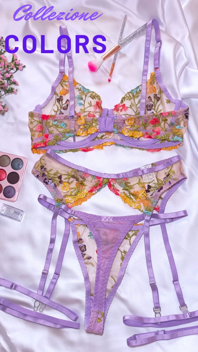 Completino in pizzo florealeย reggiseno avvolgente con un ‘eccezionale sostegno grazie al ferretto pizzo a fiori multicolor ( non elastico) elastici e spalline lilla perizoma sensuale che evidenzia il lato B reggicalze con 4 ganci+ 4 elastici effetto giarrettiera tessuto morbidissimo e spalline elasticizzate (95% poliestere , 5% spandex/elastane) CALZE NON INCLUSE