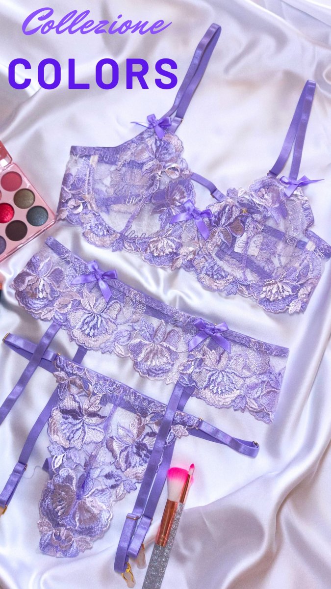 Completino in pizzo florealeย reggiseno avvolgente con un ‘eccezionale sostegno grazie al ferretto pizzo a fiori nei toni del lilla ( non elastico) perizoma sensuale che evidenzia il lato B reggicalze con 4 ganci tessuto morbidissimo e spalline elasticizzate (95% poliestere , 5% spandex/elastane) CALZE NON INCLUSE
