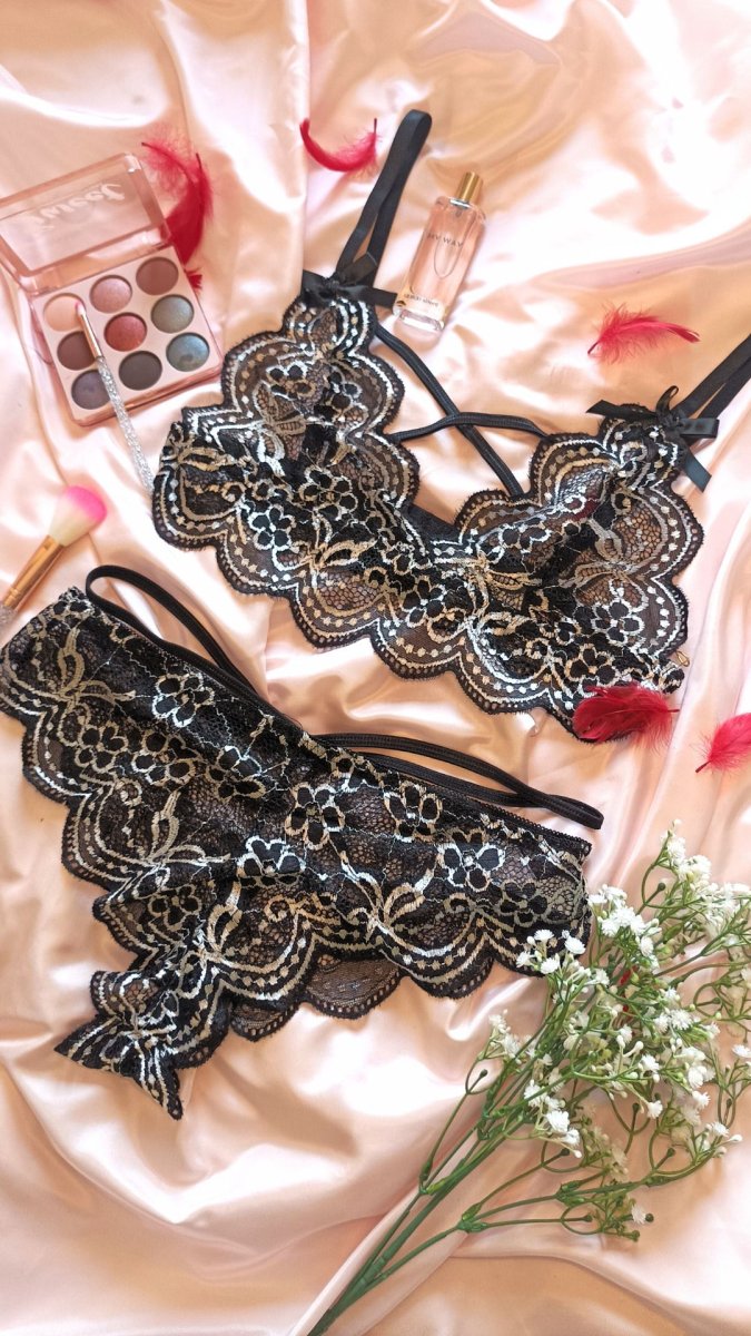Completino in pizzo florealeย reggiseno braletteย morbido e avvolgente con uno stuzzicante incrocio di lacciย pizzo a fiori bianco e nero (elasticizzato) slip brasiliano che evidenzia il lato B tessuto morbidissimo ed elasticizzato (95% poliestere , 5% spandex) CALZE NON INCLUSE