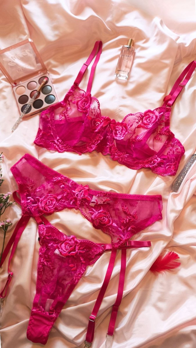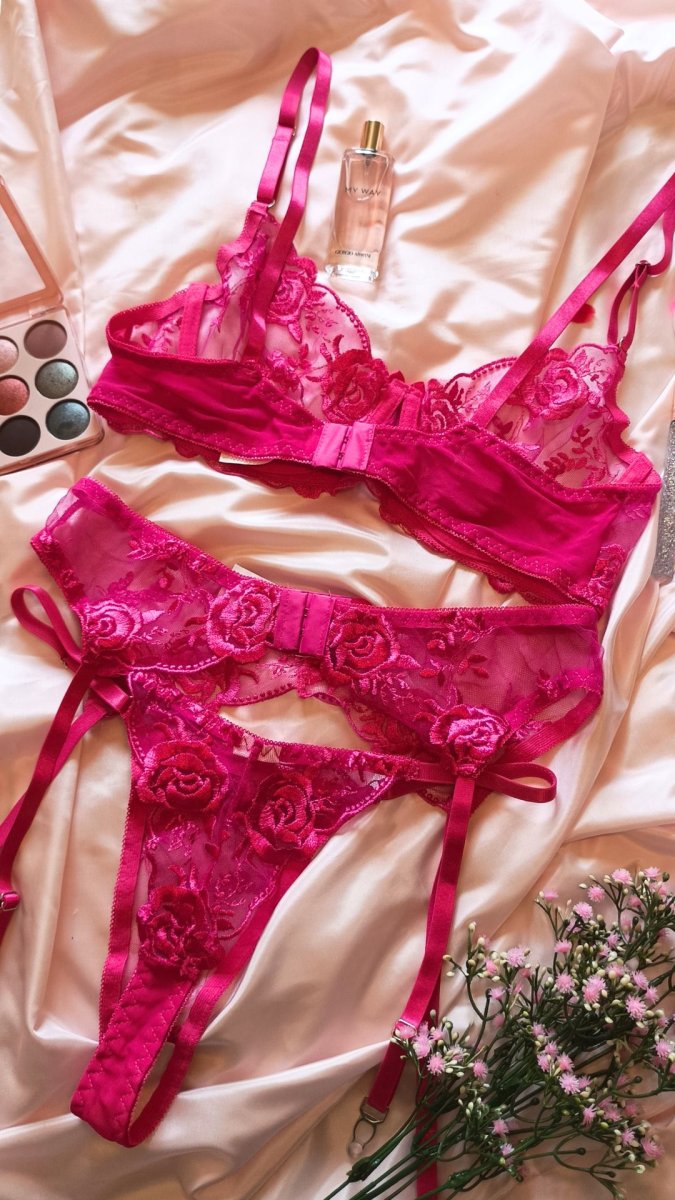 Completino in pizzo florealeย reggiseno avvolgente con un ‘eccezionale sostegno grazie al ferretto pizzo a fiori nei toni del fucsia (non elasticizzato) perizoma sensuale che evidenzia il lato B reggicalze con 4 ganci tessuto morbidissimo e spalline elasticizzate (95% poliestere , 5% spandex/elastane) CALZE NON INCLUSE