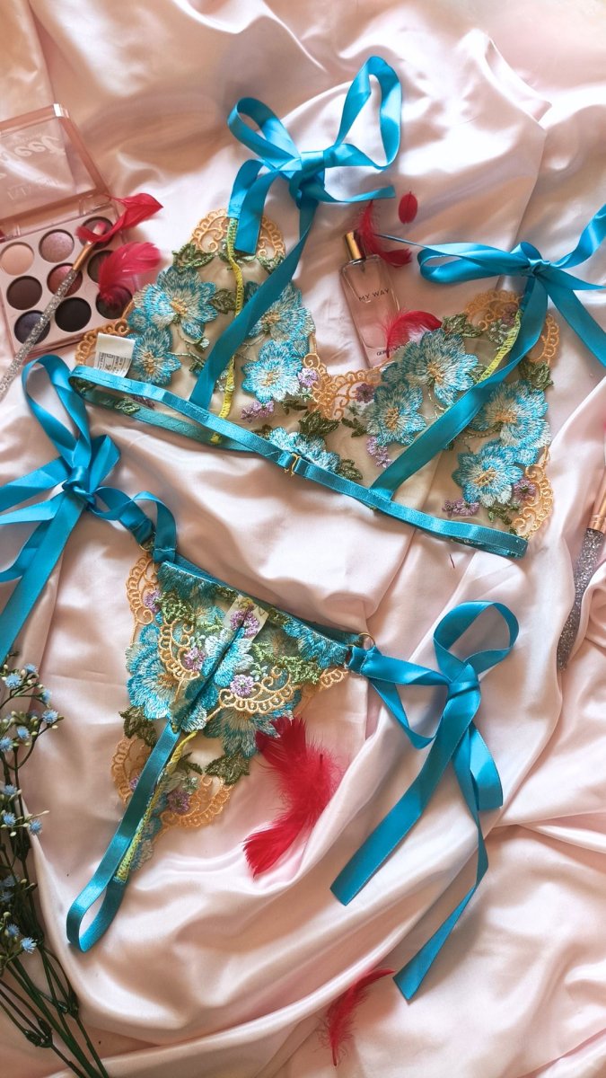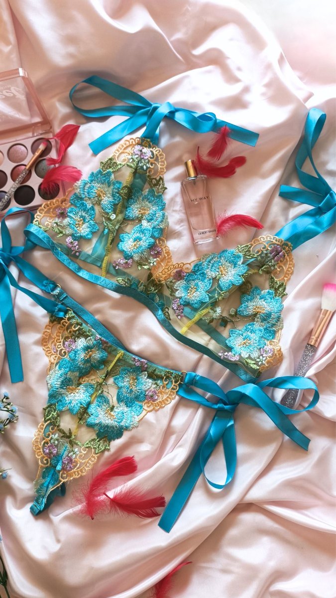 Completino in pizzo florealeย reggiseno braletteย morbido e avvolgente con uno stuzzicante incrocio di lacciย pizzo a fiori blu e nero (elasticizzato) slip brasiliano che evidenzia il lato B tessuto morbidissimo ed elasticizzato (95% poliestere , 5% spandex) CALZE NON INCLUSE