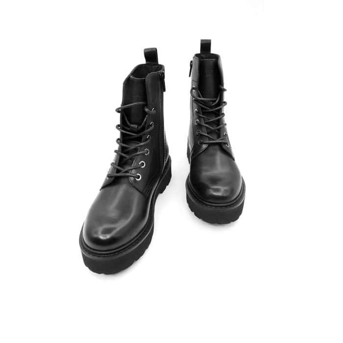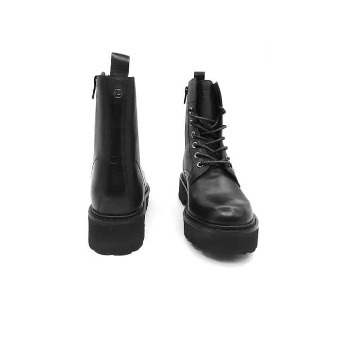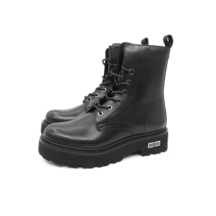 Anfibio in vitello nero con allacciatura a 6 fori. Interno in pelle. Zip laterale. Fondo in gomma. Modello Slash 1814.