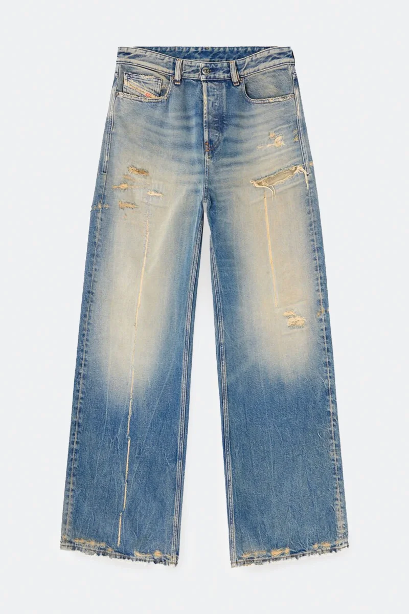 Questo lavaggio blu chiaro in denim 100% cotone richiede quasi due giorni di lavorazioni specializzate. Un’interpretazione artigianale dell’estetica destroyed, parte del DNA Diesel, presenta whisker e sfumature create con molteplici passaggi laser. Lavaggi enzimatici e nebulizzati esaltano lโeffetto vissuto, mentre tagli, patch e abrasioni sono applicati e rammendati interamente a mano. Ogni capo รจ unico, rifinito con tintura a pigmenti naturali e modellatura 3D in resina. Bottoni e rivetti ricoperti in resina azzurra completano il look.