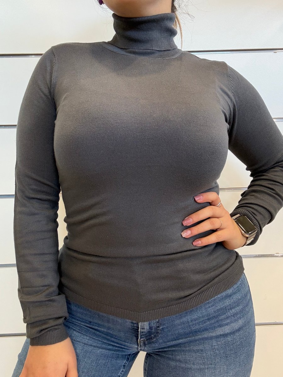 Dolcevita grigio scuro in morbida maglia, composto da 83% viscosa e 17% nylon, con collo alto e linea raffinata. Un capo versatile e confortevole, ideale per ogni occasione.