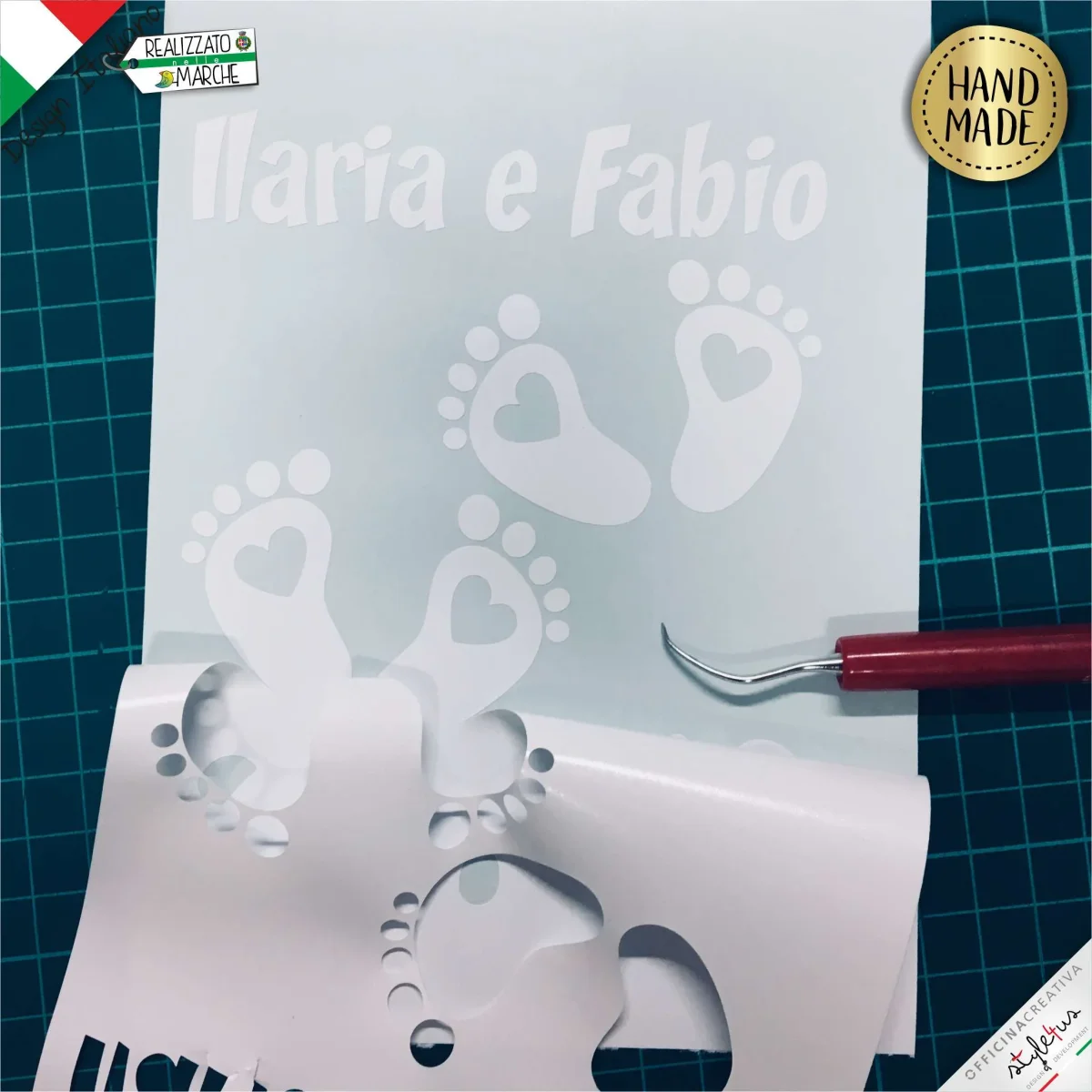 l’adesivo รจ realizzato spellicolando a mano grazie all’ausilio di uncini e pinzette, un unica lastra di materiale vinilico laminato