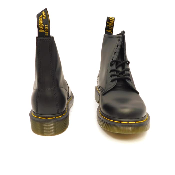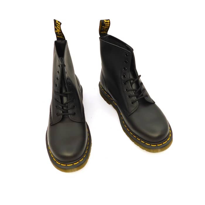 Anfibio in vitello nero con allacciatura a 8 fori. Fondo in gomma con cucitura gialla. Modello: 1460 Smooth.