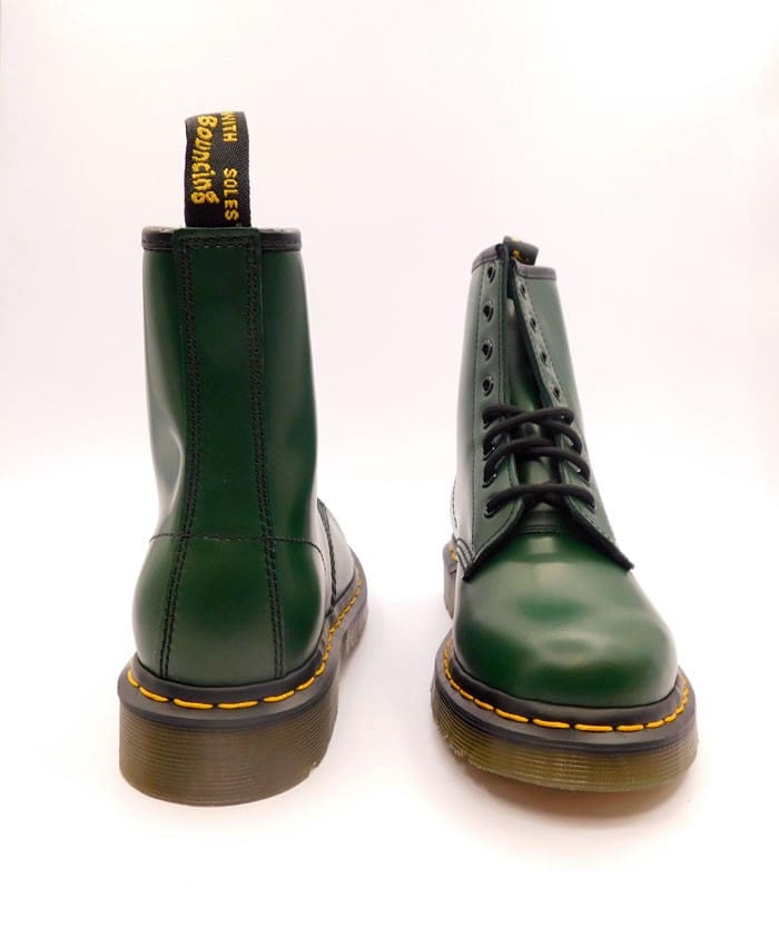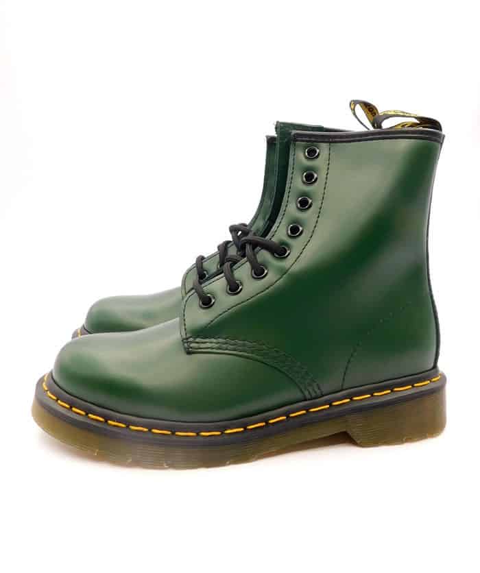 Anfibio in pelle verde con cucitura giallo. Interno in pelle. Fondo in gomma.