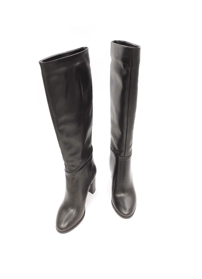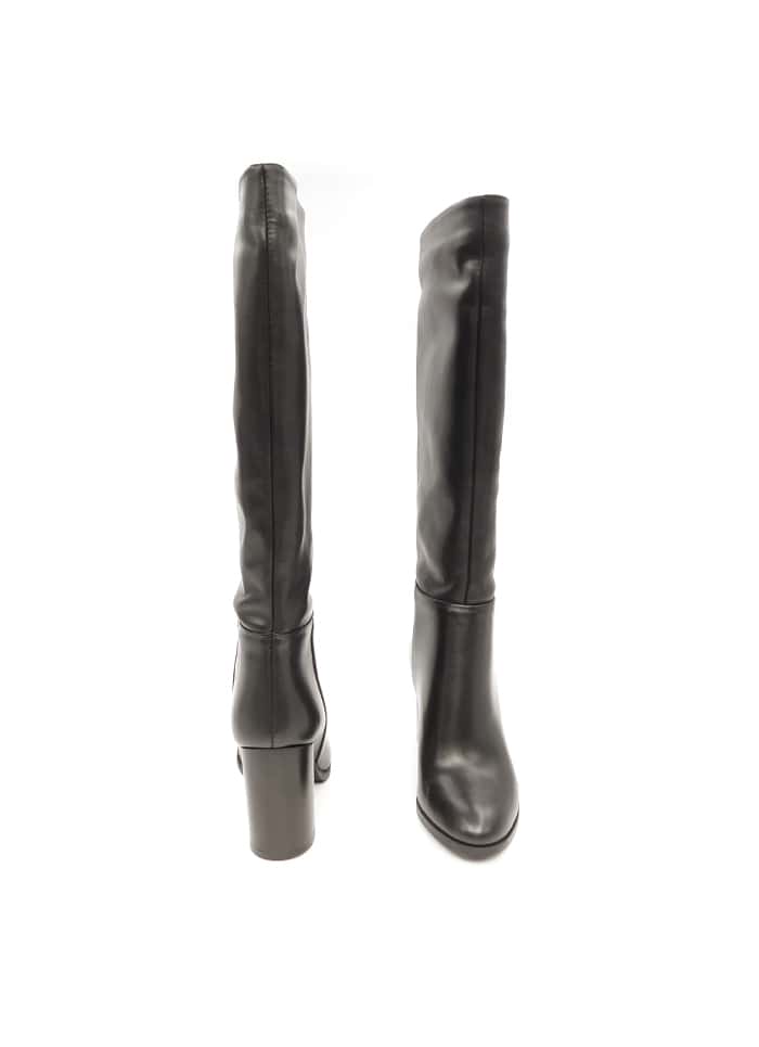 Stivale in vitello nero con gambale alto a tubo. Interno in pelle. Tacco 8 cm.