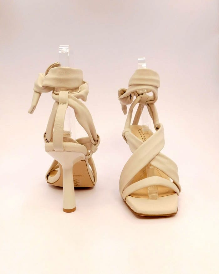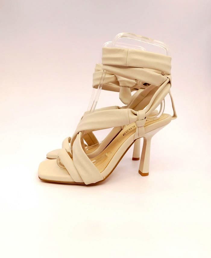 Sandalo in vitello con lacci alla schiava. Interno in pelle .Tacco 8 cm. Fondo in cuoio.