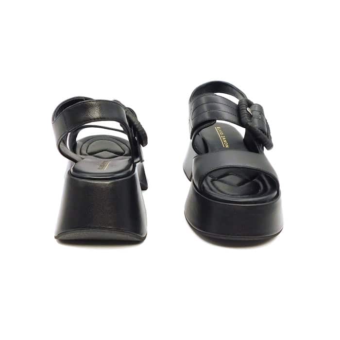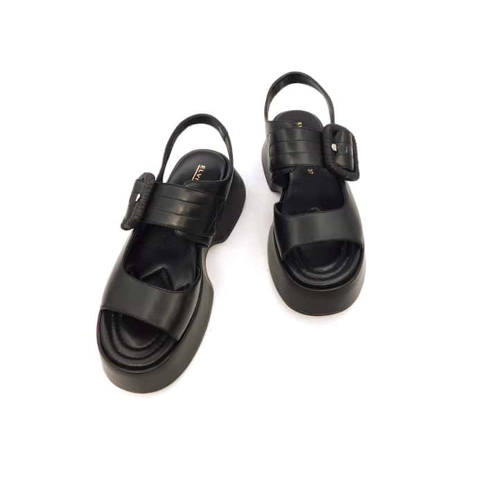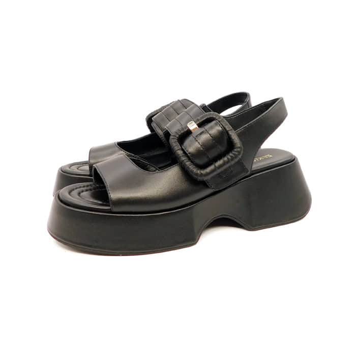Sandalo in vitello nero con accessorio fibbia. Interno in pelle. Fondo zeppa 3 cm. Made in Italy.