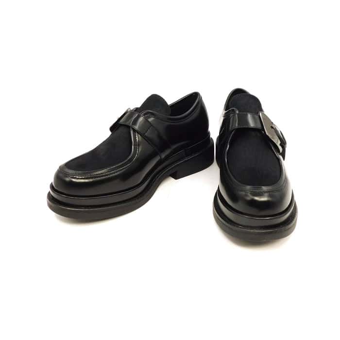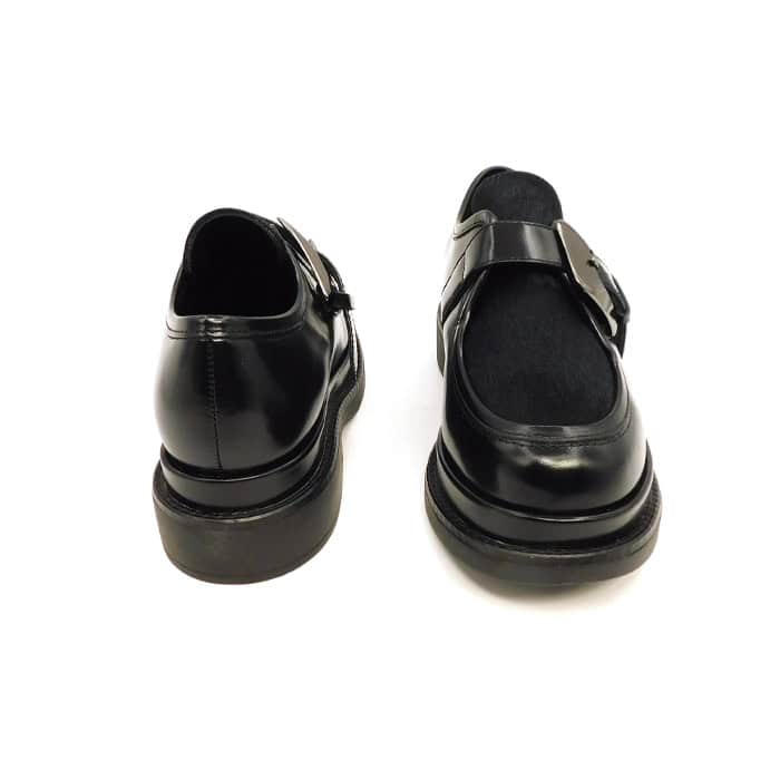 Scarpa in vitello nero lucido e materiale sintetico a pelo corto tono su tono. Fondo in gomma 2 cm. Fibbia laterale in metallo. Interno in pelle.