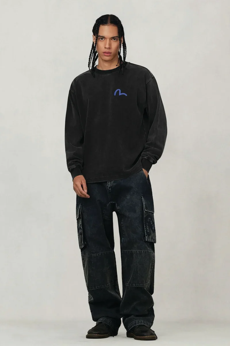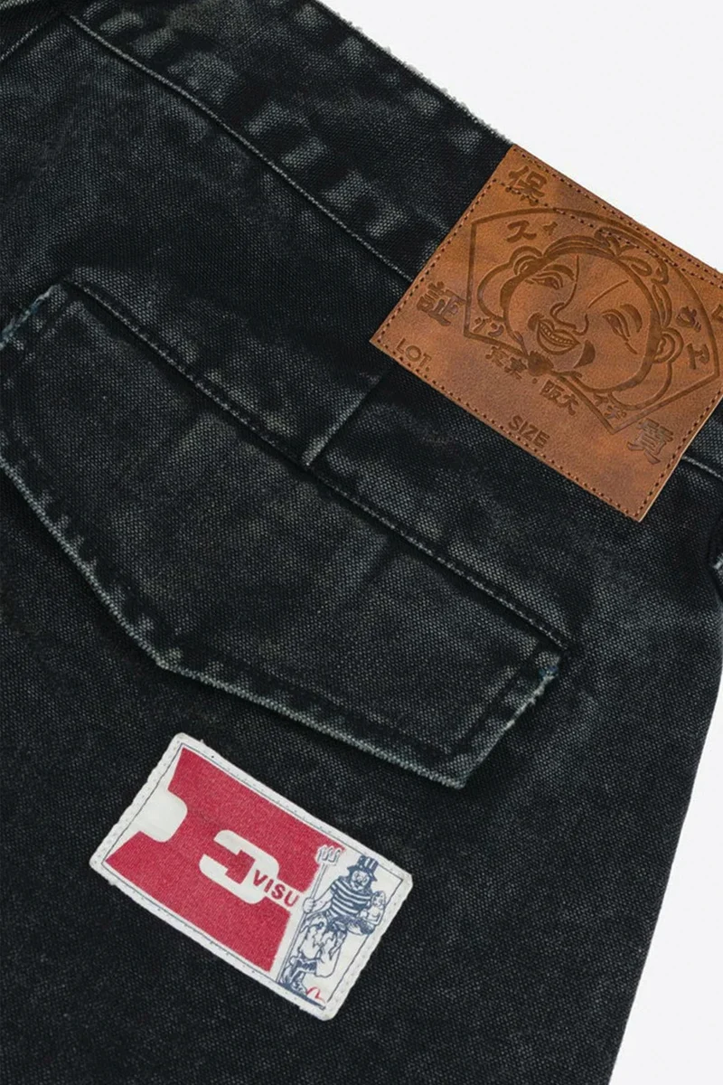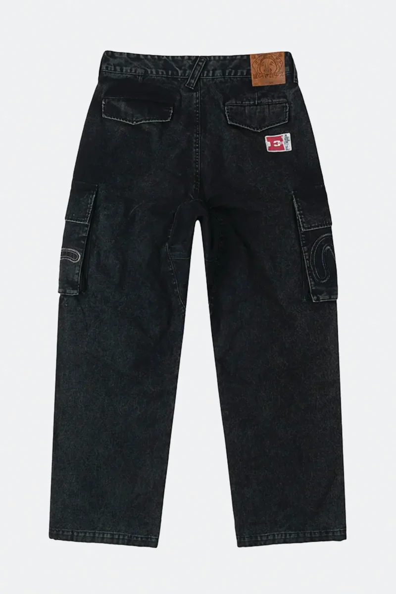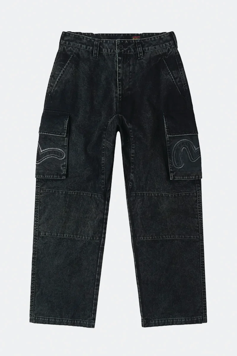 Evisu Distressed Seagull Appliqué Embroidery And Multi-pocket Loose Fit Cargo Pants Nero Uomo