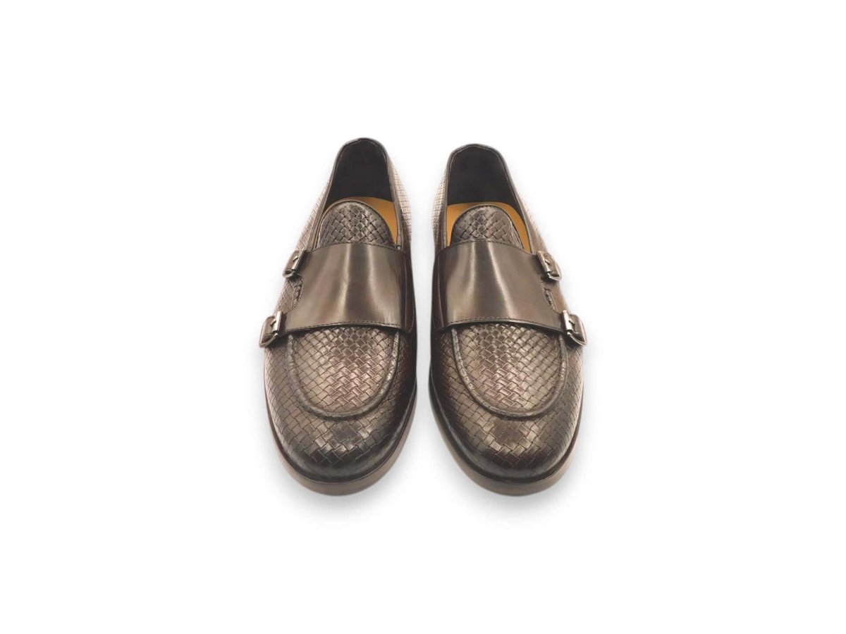 Scarpa bassa in vitello stampato. Allacciatura con fibbie. Fondo in cuoio. Interno in pelle.