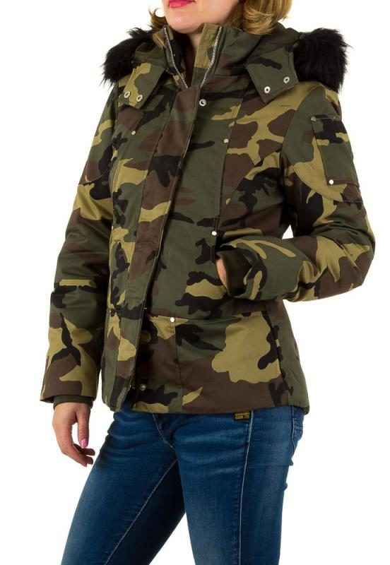 Giubbotto verde mimetico con cappuccio eย pelliccia sintetica colore nero , caldo e confortevole ma femminile allo stesso tempo.