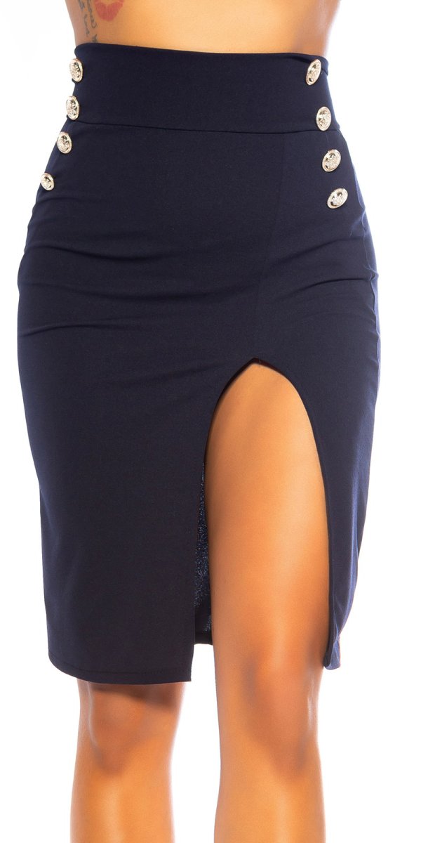 Gonna sexy a vita altaย midi a tubino con profondo spacco laterale. Due file lateraliย di bottoni dorati impreziosiscono la vita di questa gonna davvero sensuale.