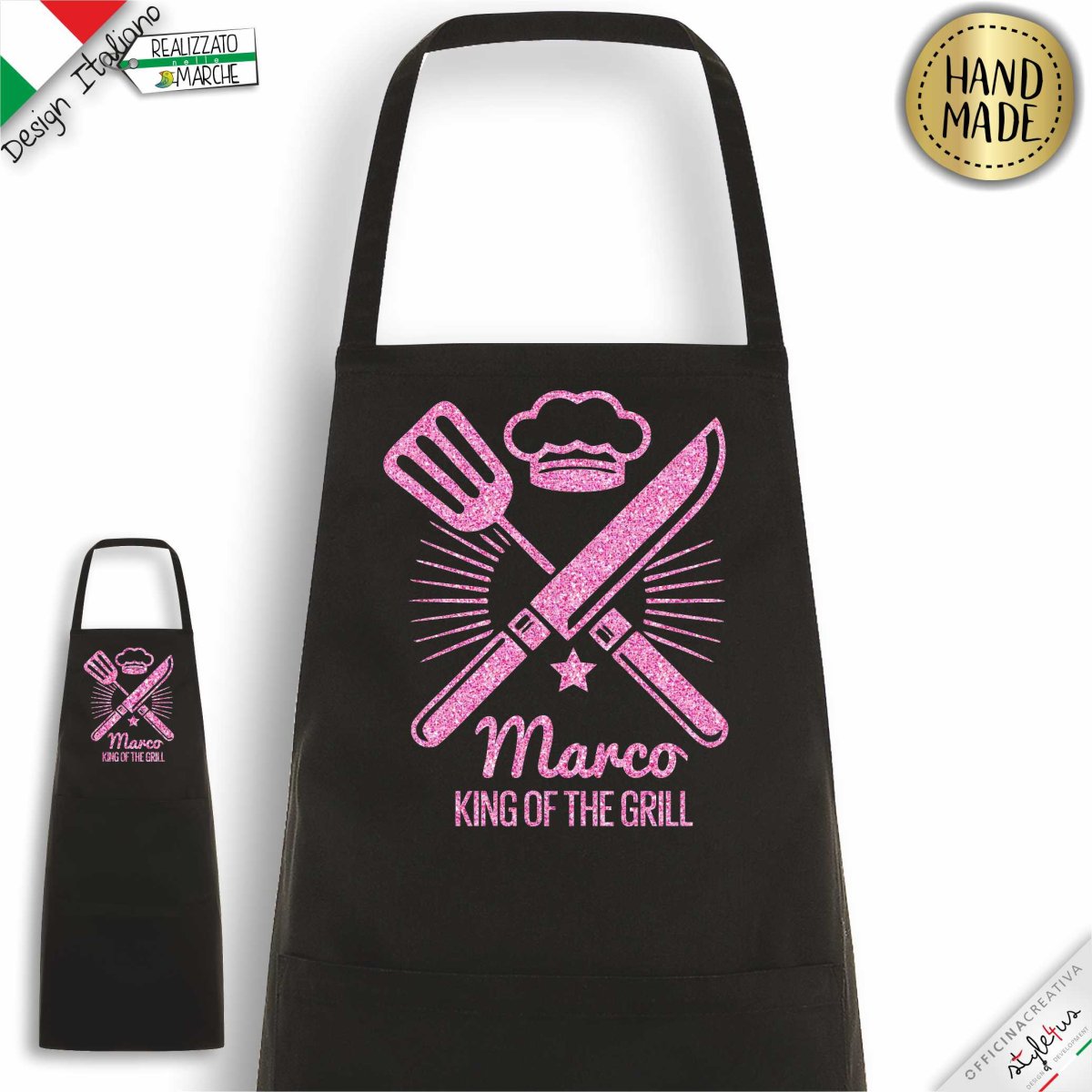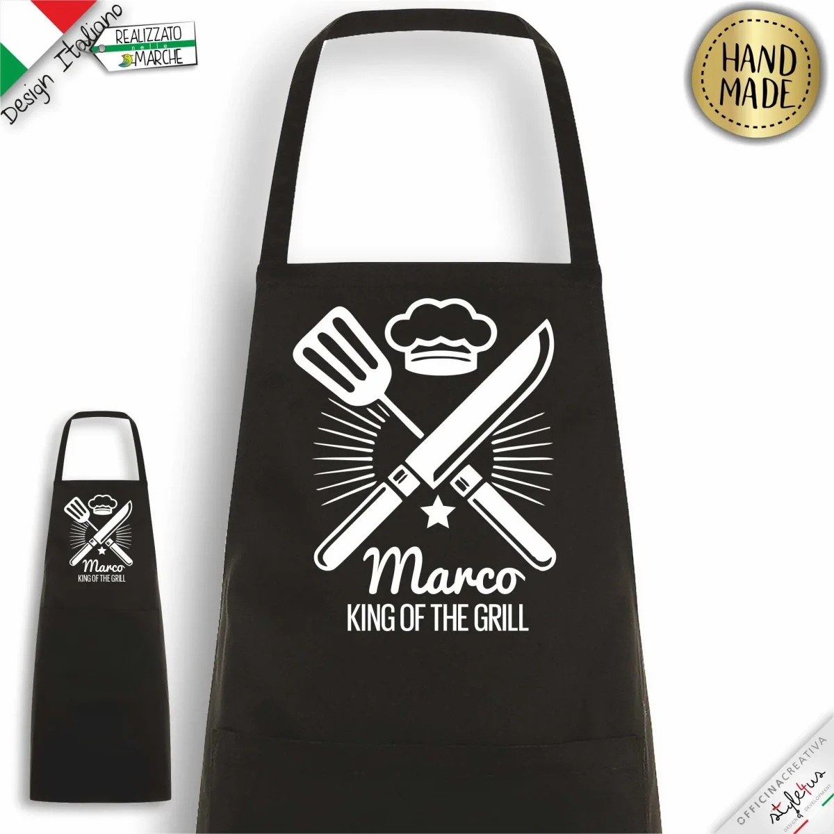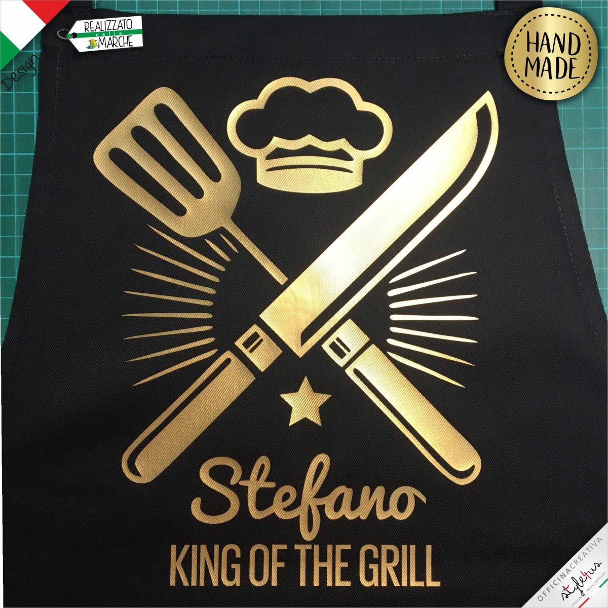 Grembiule personalizzato King of the Grill stampato con materiali da intaglio e personalizzato con il nome che desideri. Disegnato e Lavorato con amore a Sarnano, piccolo paesino marchigiano del centro Italia Scegli il COLORE del grembiule, il colore della LAVORAZIONE scrivi il NOME che vuoi stampato