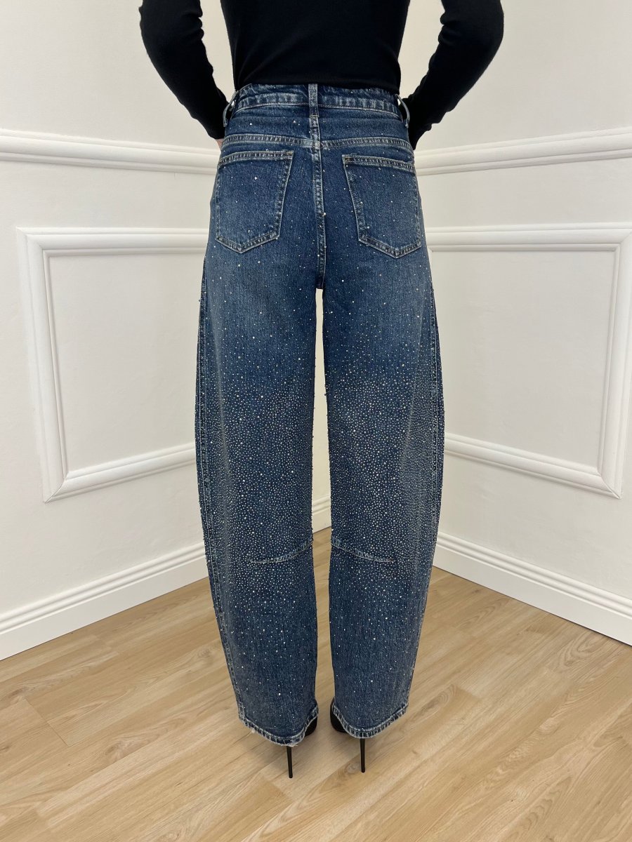 Jeans 5 tasche modello balloon, a vita medio alta, in tela fissa di denim, con applicazioni strass all over.