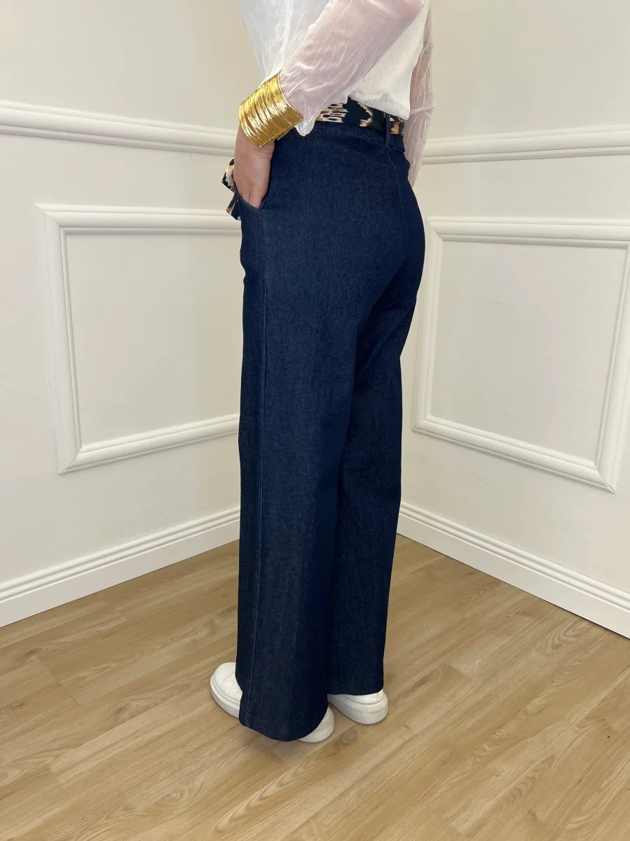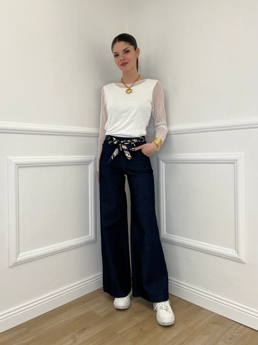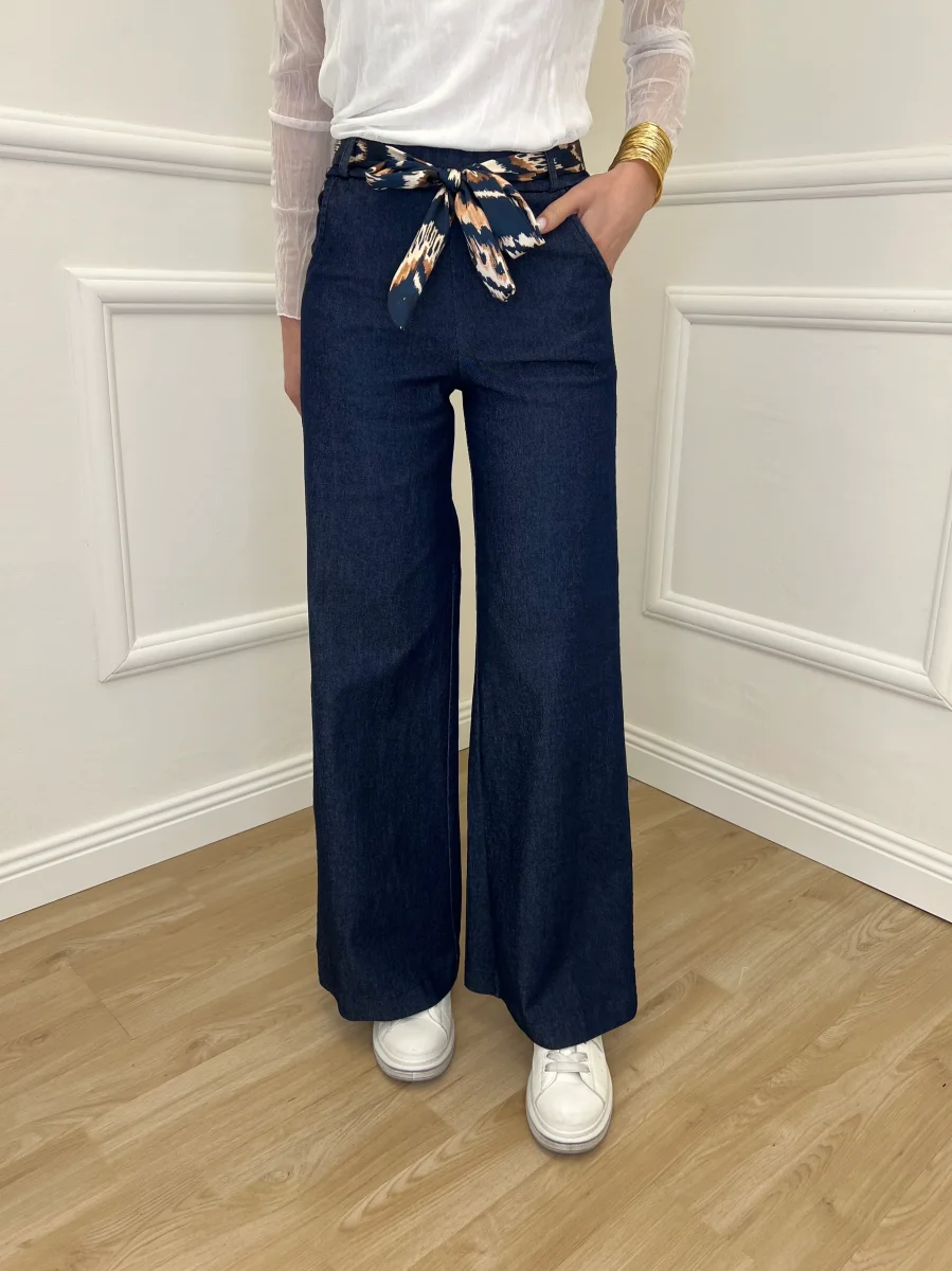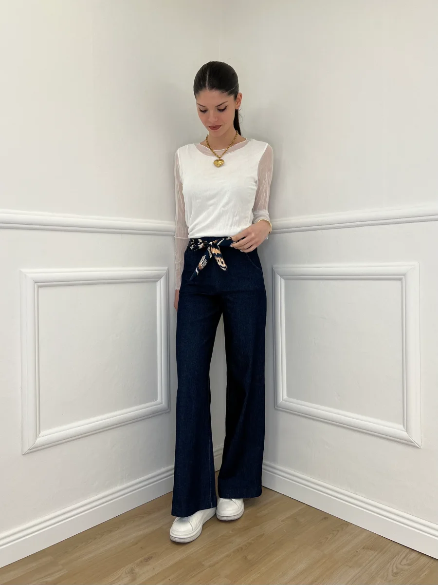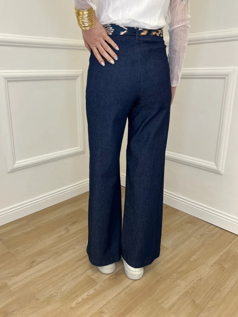 Pantalone a palazzo elasticizzato in chambray a vita medio alta, con tasche laterali. Dettaglio vita elastica e con passanti e fusciacca in fantasia rimovibile.