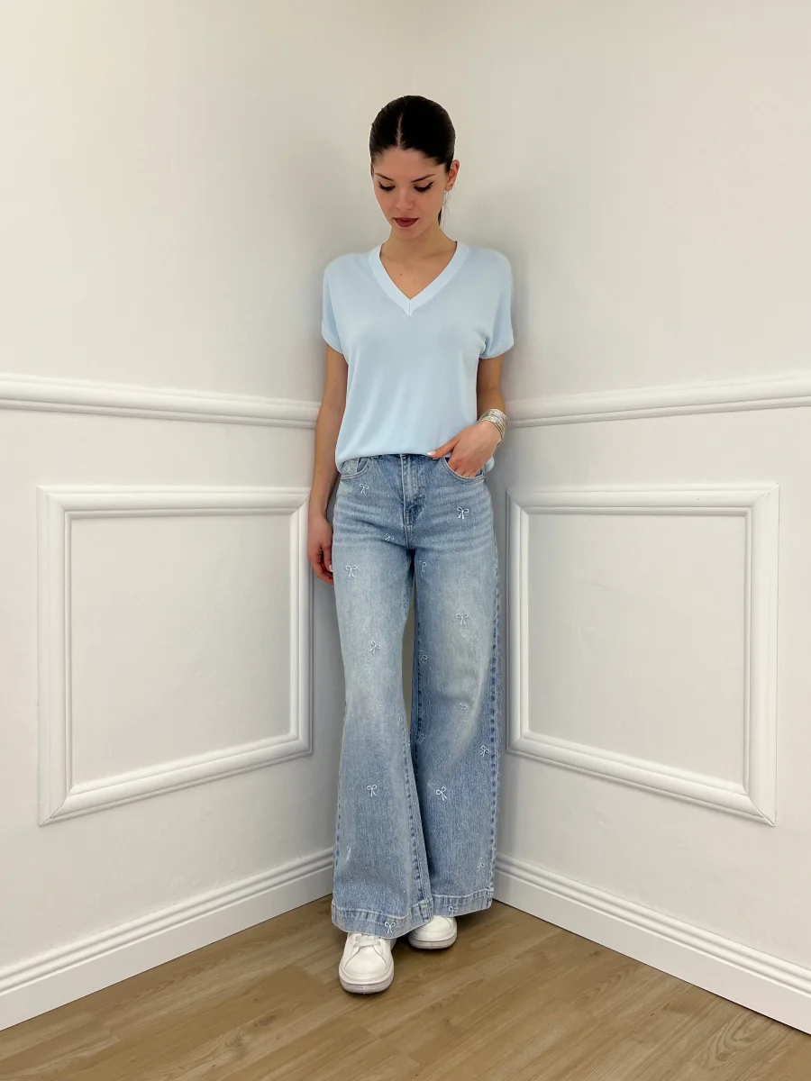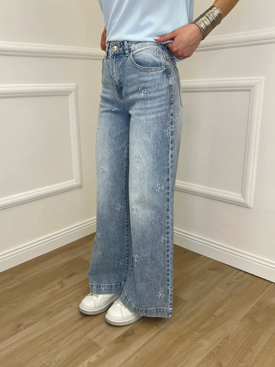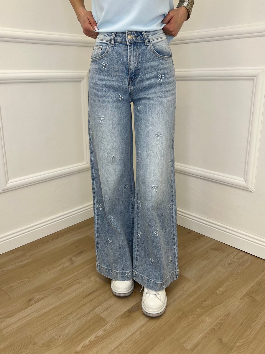 Jeans 5 tasche a palazzo a vita medio alta in denim elasticizzato effetto delavรฉ, con dettaglio fiocchi ricamati “all over” e applicazioni micro strass.