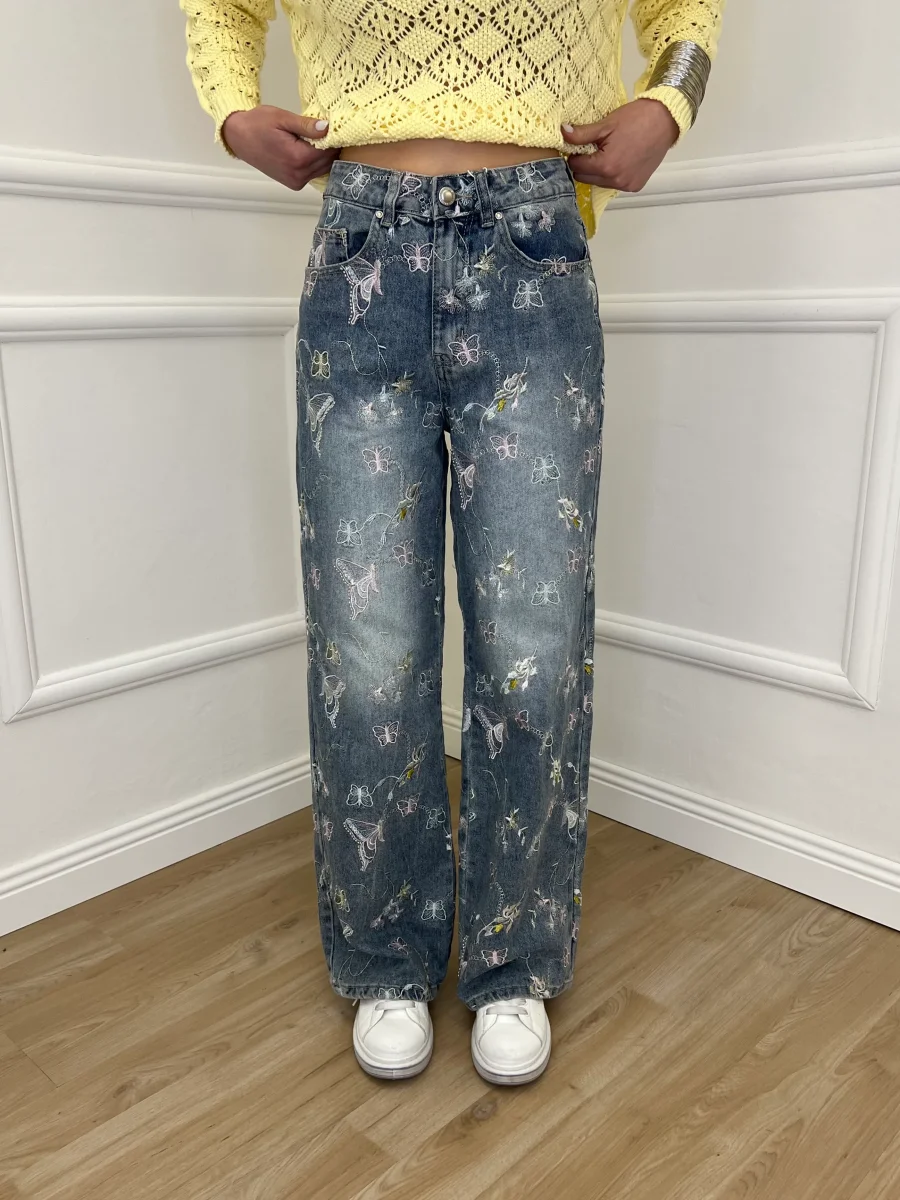 Jeans 5 tasche wide leg in denim slavato, impreziosito da ricami e paillettes a contrasto.