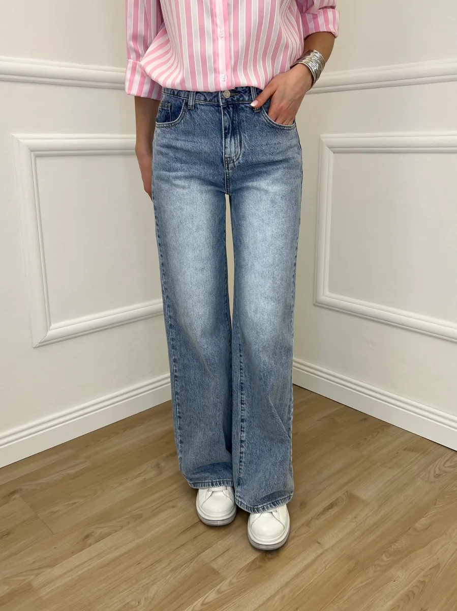 Jeans 5 tasche wide leg a vita medio alta in denim leggermente elasticizzato, con dettaglio rotture e abrasioni posteriori e tasca sinistra a contrasto con applicazioni strass.