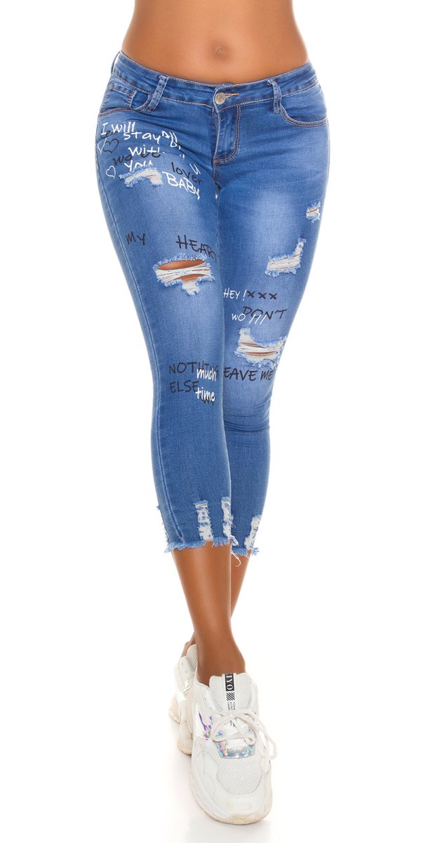 Jeans leggermente elasticizzato pinocchietto a vita bassa elasticizzato modello 5 tasche con scritte decorative e strappi.
