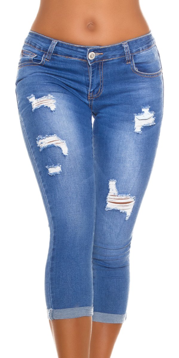 Jeans leggermentet elasticizzato pinocchietto a vita bassa elasticizzato modello 5 tasche con strappi decorativi.