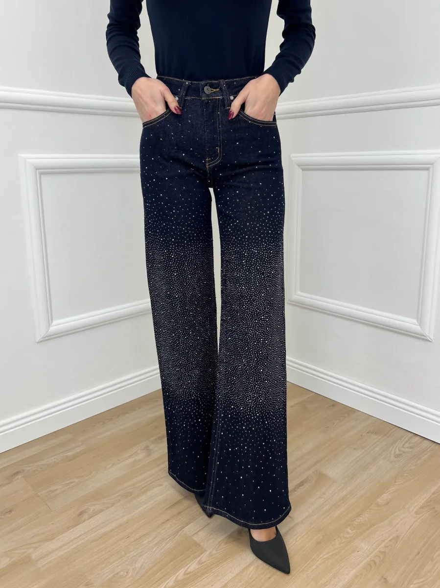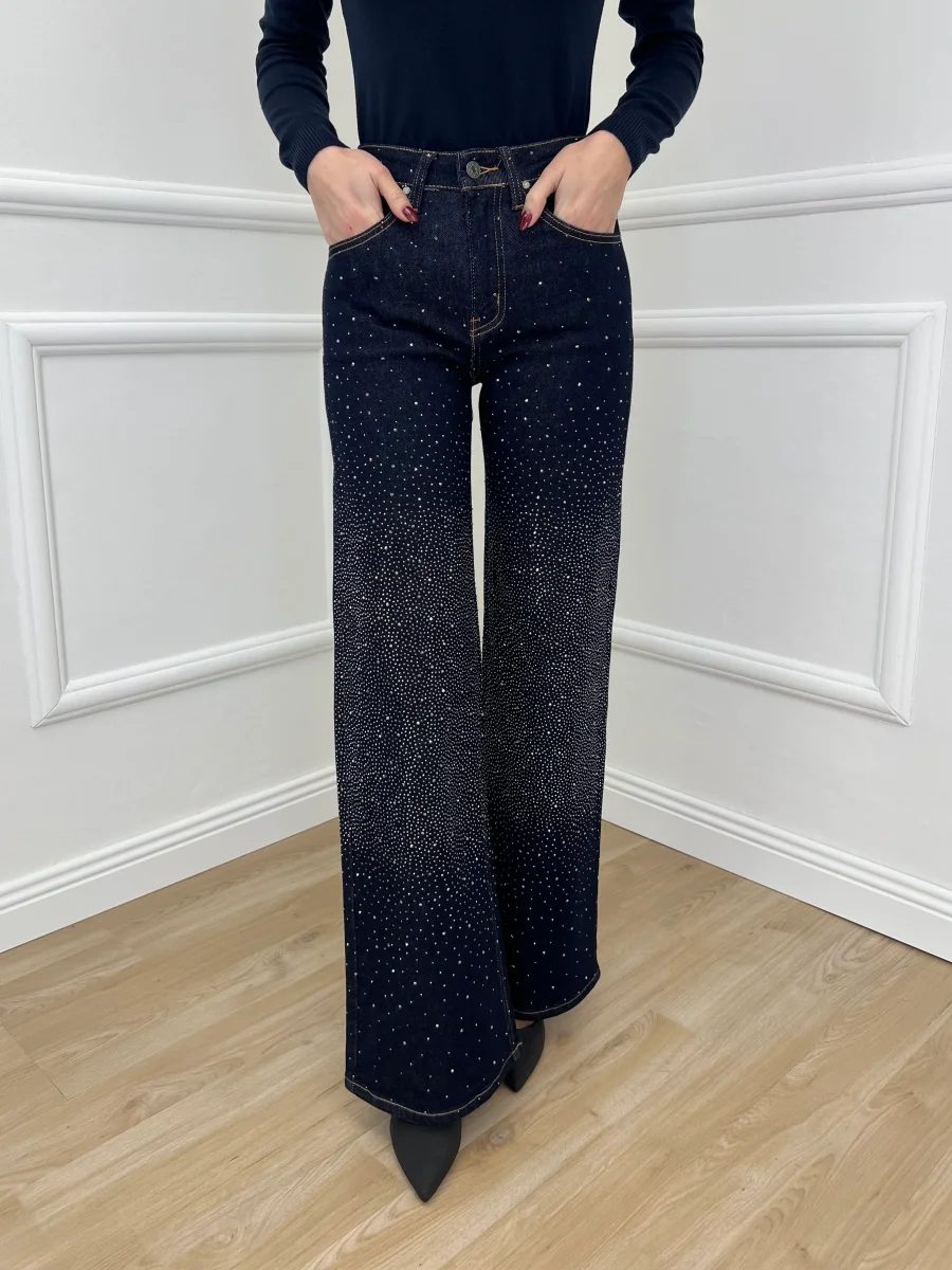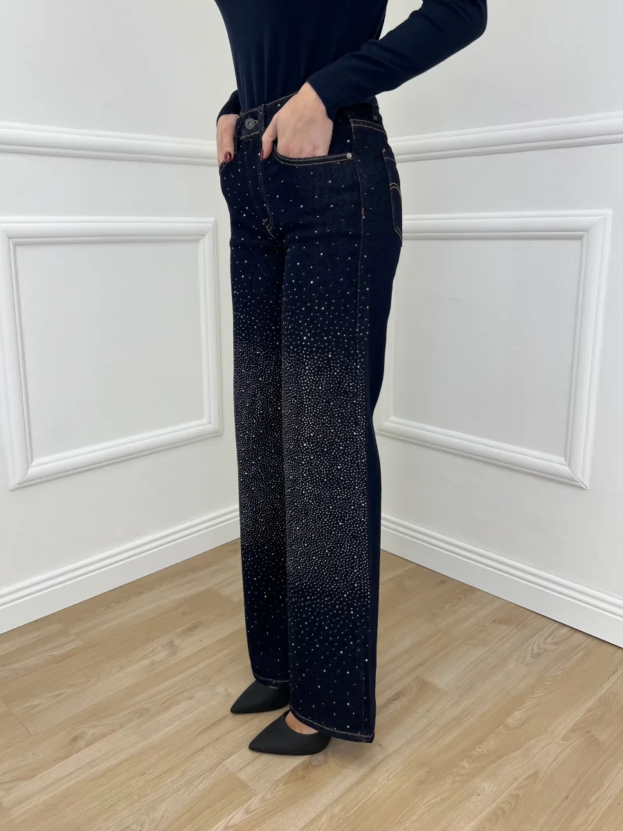 Jeans 5 tasche wide leg a vita medio alta in denim elasticizzato con applicazioni strass frontali e impunture a contrasto.