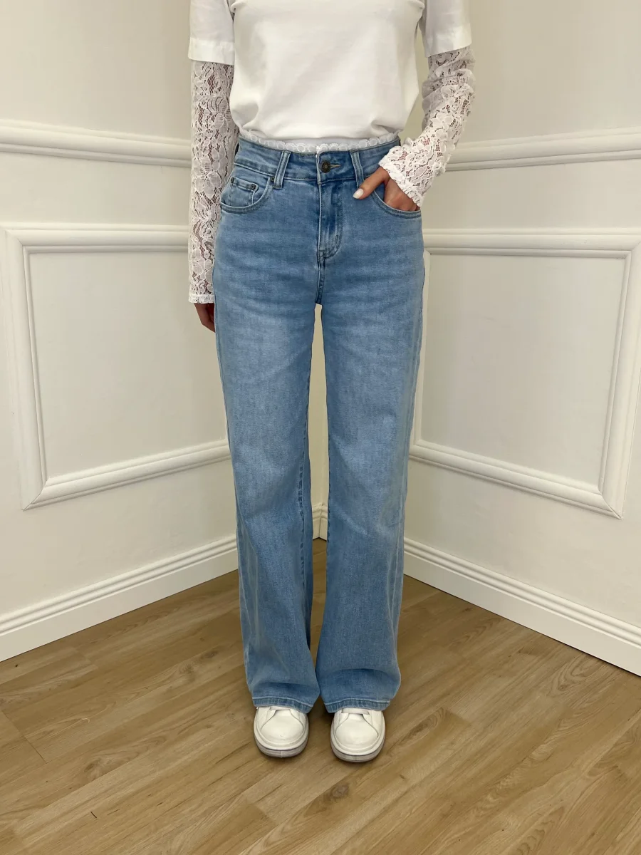Jeans 5 tasche straight fit a vita medio alta in denim di puro cotone super elasticizzato. Dettaglio vita con ricamo in pizzo.