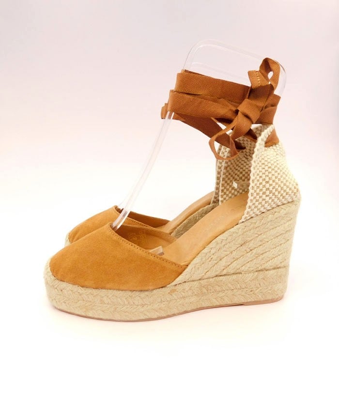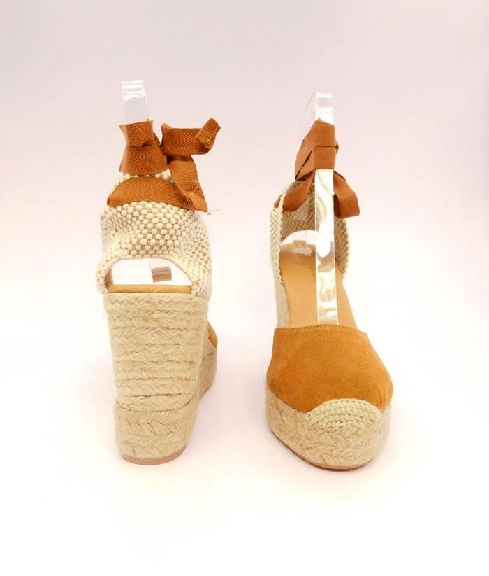 Campesina in camoscio con laccio alla caviglia. Interno in pelle. Zeppa in corda 9 cm. Fondo in gomma.