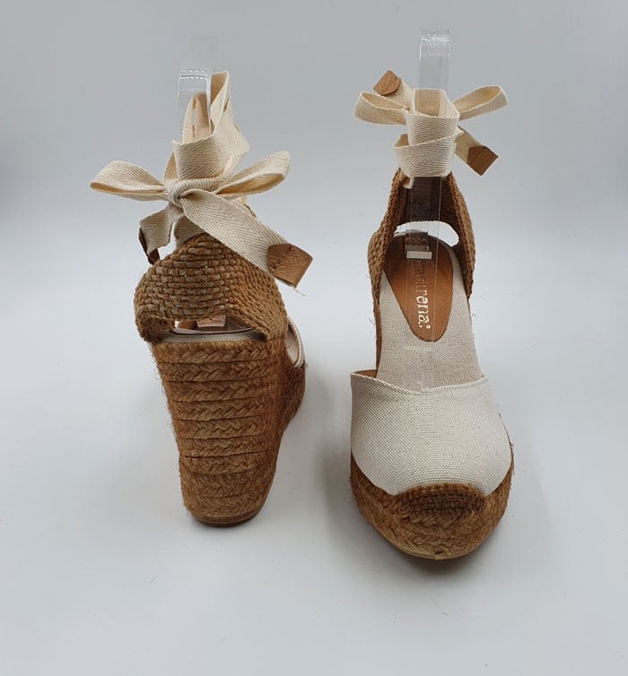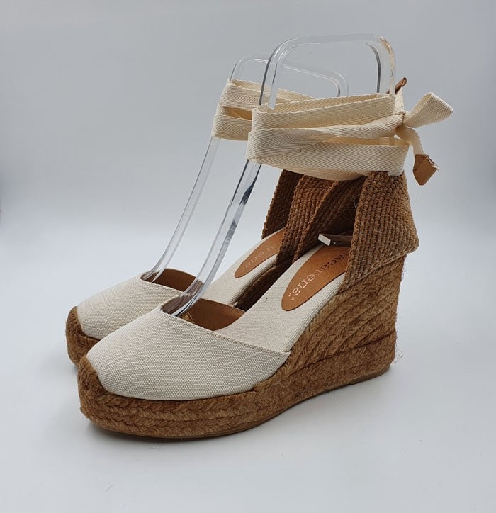 Campesina in tessuto con laccio alla caviglia. Interno in pelle. Zeppa in corda 9 cm. Fondo in gomma.