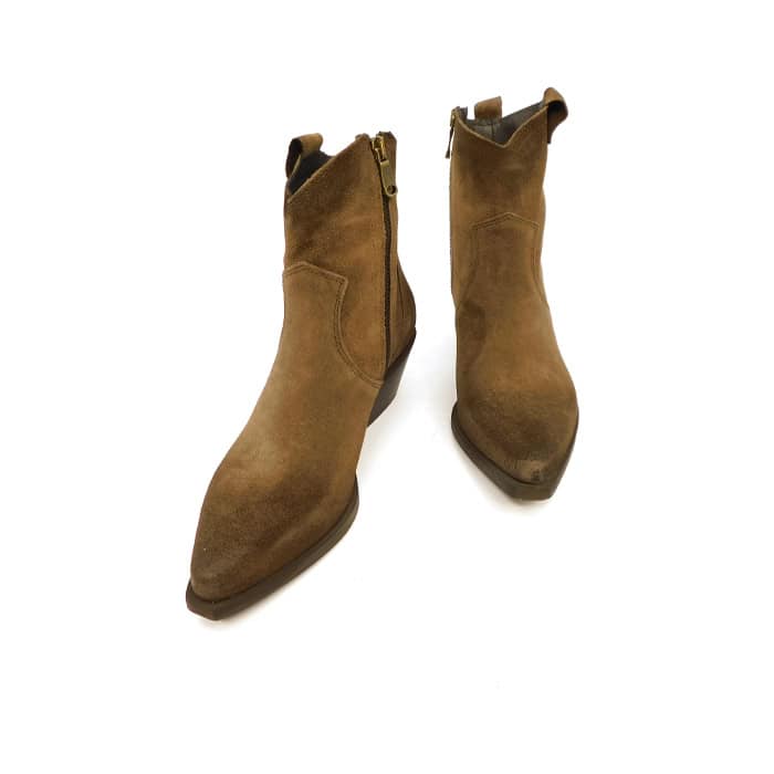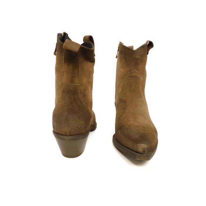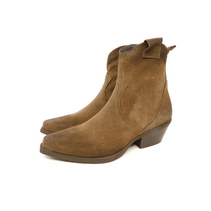 Texano in pelle scamosciata e ingrassata tortora con zip laterale. Interno in pelle. Tacco 5 cm. Made in Italy.