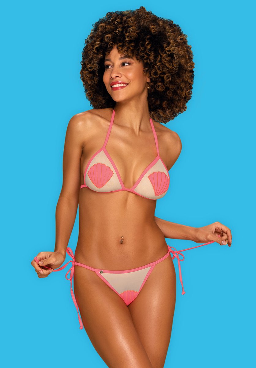 Costume da bagno bikini, in tulle rosa trasparente con applicazione a conchiglia. Adattamento perfetto per ogni forma del corpo conchiglie avvolgentiย –ย aspetto magnifico
