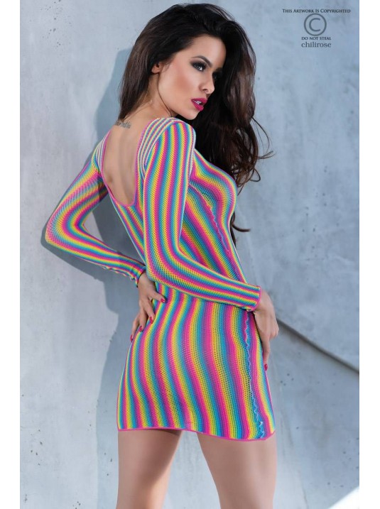 Mini abito in microrete stretch a righe verticali color arcobaleno, con maniche lunghe e scollo tondo.