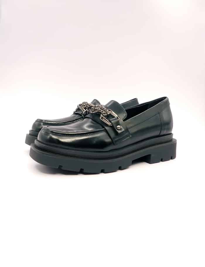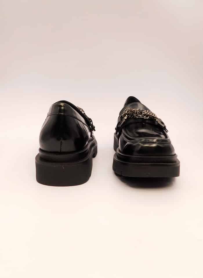 Mocassino in vitello con accessorio catena. Interno in pelle.ย Fondo carrarmato in gomma.