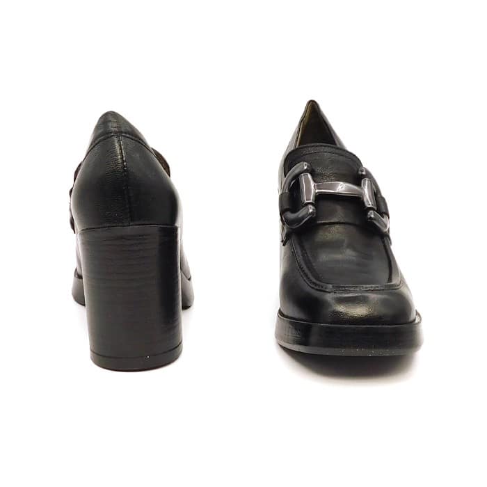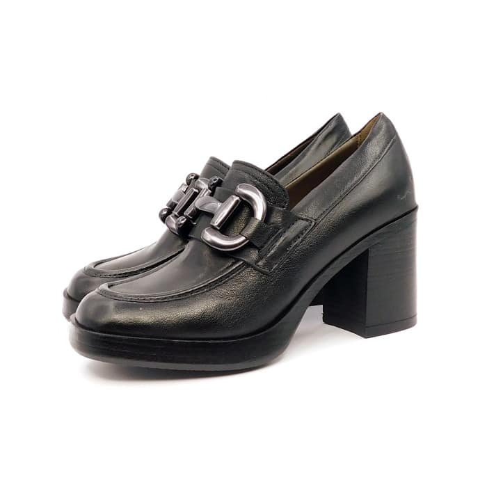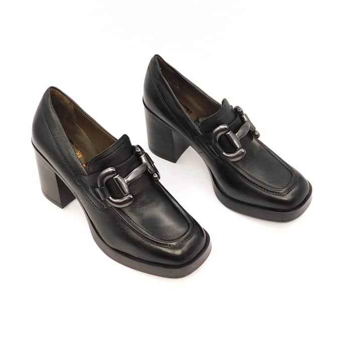 Mocassino in vitello nero con morsetto color piombo. Interno in pelle. Tacco 7 cm con plateau.