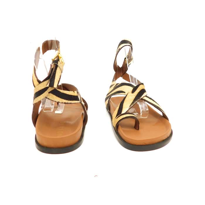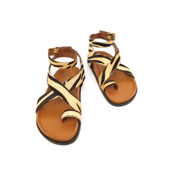 Sandalo infradito in cavallino con stampa zebrata. Cinturino alla caviglia. Interno in pelle. Fondo in gomma.