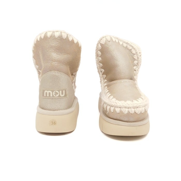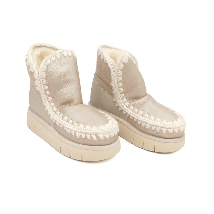 Pantofola in pelle di montone double face metallizzato. Cuciture in lana all’uncinetto. Altezza del gambale 18 cm. Fondo platform 2 cm. Suola esterna in Eva e gomma.