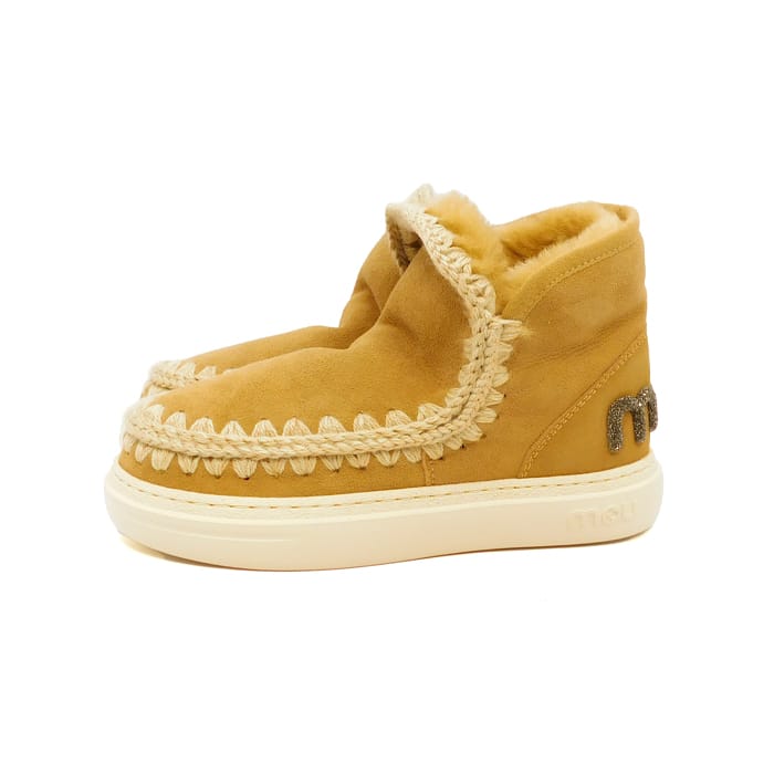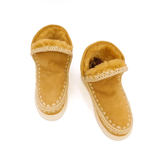 Tronchetto eskimo cuoio lavorato a mano in pelle di montone double face con logo glitter. Cuciture in lana. Tallone rinforzato e una suola in gomma. Altezza 15,5cm.