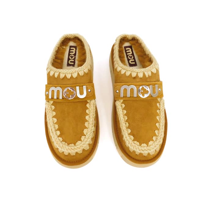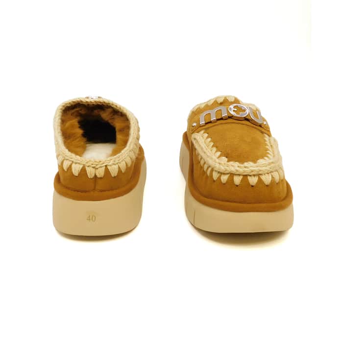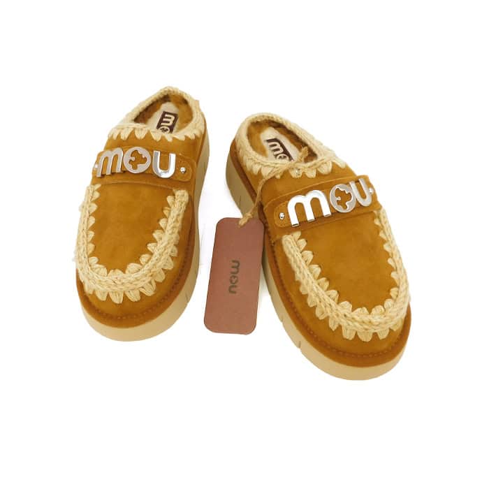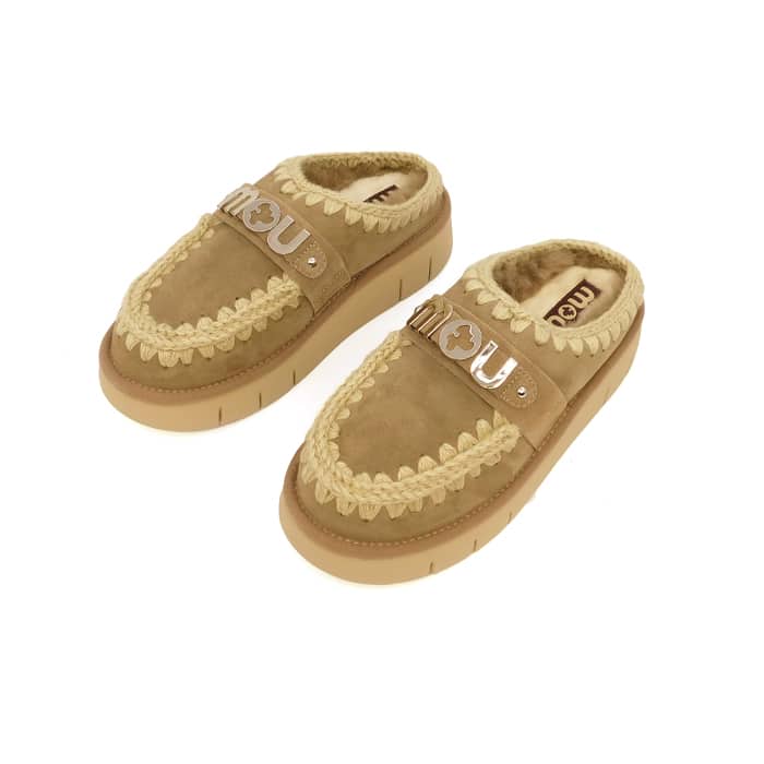 Sabot bounce clog con logo metallizzato realizzato a mano in vera pelle di montone double face e dettagli all’uncinetto, distintivi di mou. Plantare imbottito in pelle e la suola leggera in EVA & gomma.