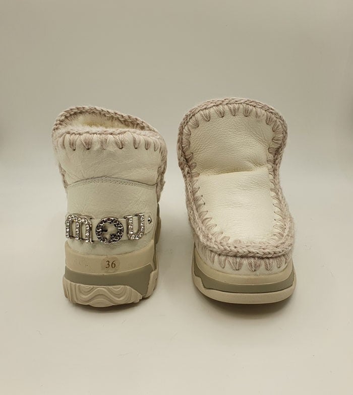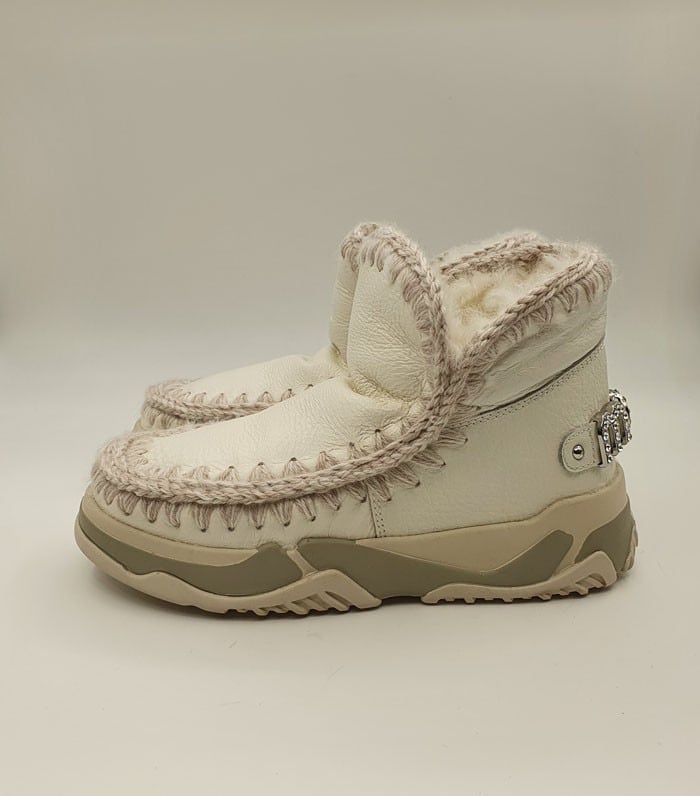 Tronchetto in pelle bianco con logo di brillantini. Interno in montone. Fondo zeppa 3 cm in gomma.