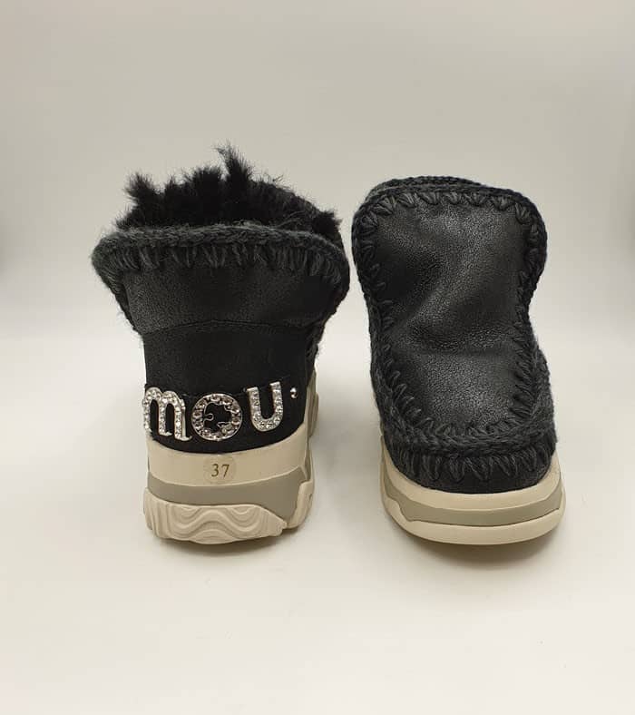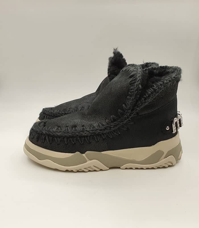 Tronchetto in pelle nero con logo di brillantini. Interno in montone. Fondo zeppa 3 cm in gomma.