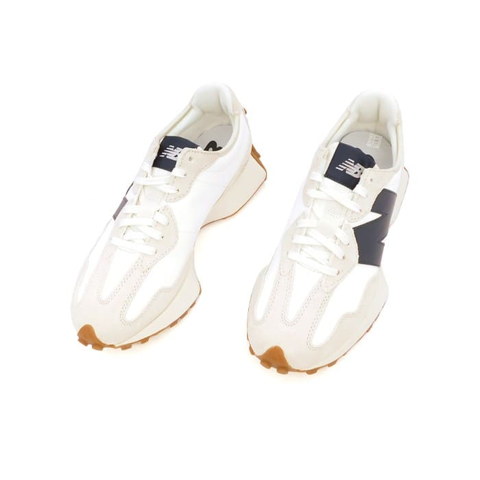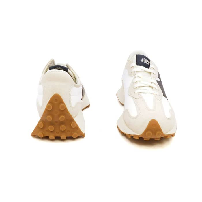 Sneaker in vitello bianco e camoscio tortora. Logo N laterale blu. Fondo in gomma biscotto.