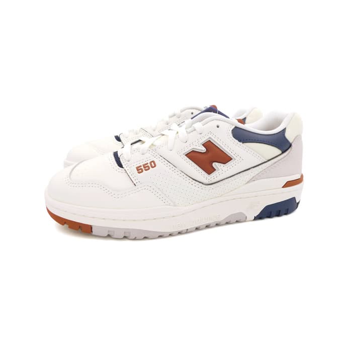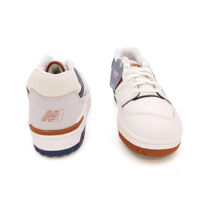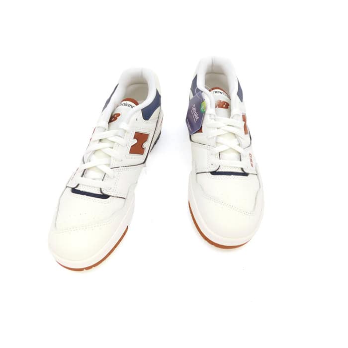 Sneaker in pelle panna con dettagli bordeaux e blu. Fondo in gomma. Modello BB 550 PTA.